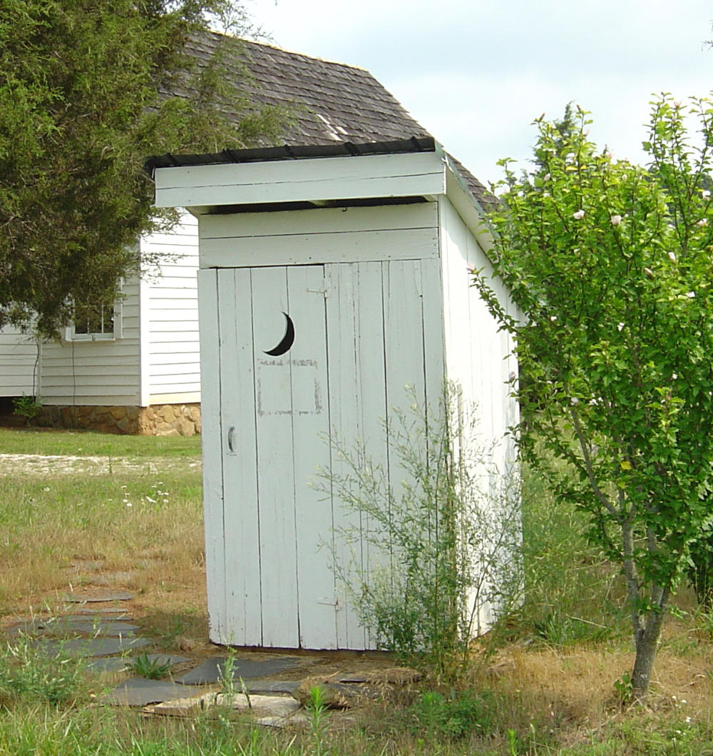 An original, functional outhouse that came with the Wesley Chapel when it was moved to its current location at Clover Hill Village.